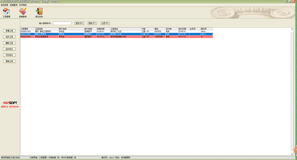 5、 工程查询:查看所有报价单,可以根据不同的条件查询不同的报价。