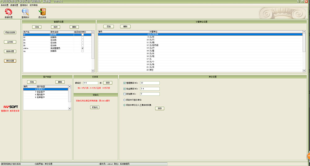 4、其它设置:其它设置中主要是对管理员,计量单位,客户类型等信息。