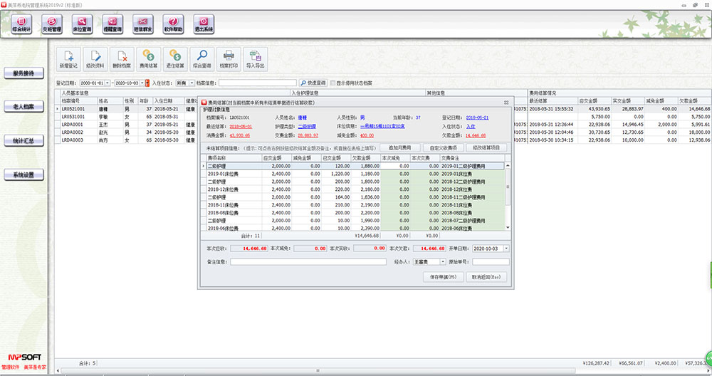 3、统计报表丰富,可对老人的续费、欠费、缴费、请假、护理情况,床位实时使用情况,咨询接待、员工工作情况进分析汇总。