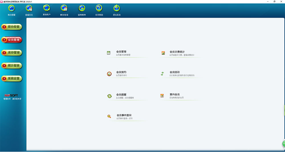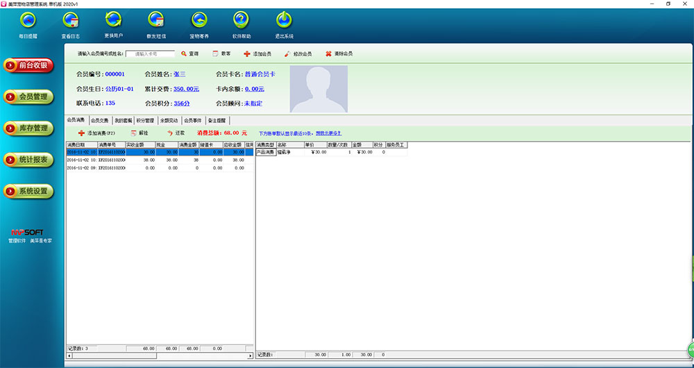 2、支持储值卡、折扣卡、计次卡,会员提醒(包括生日提醒),会员来电提示,短信群发