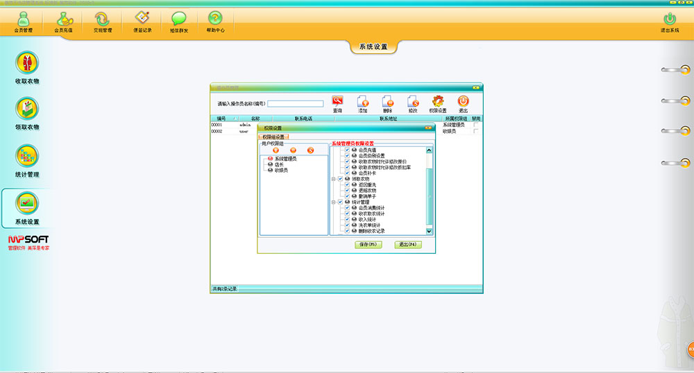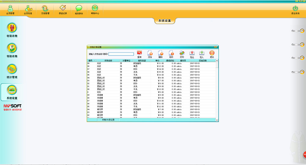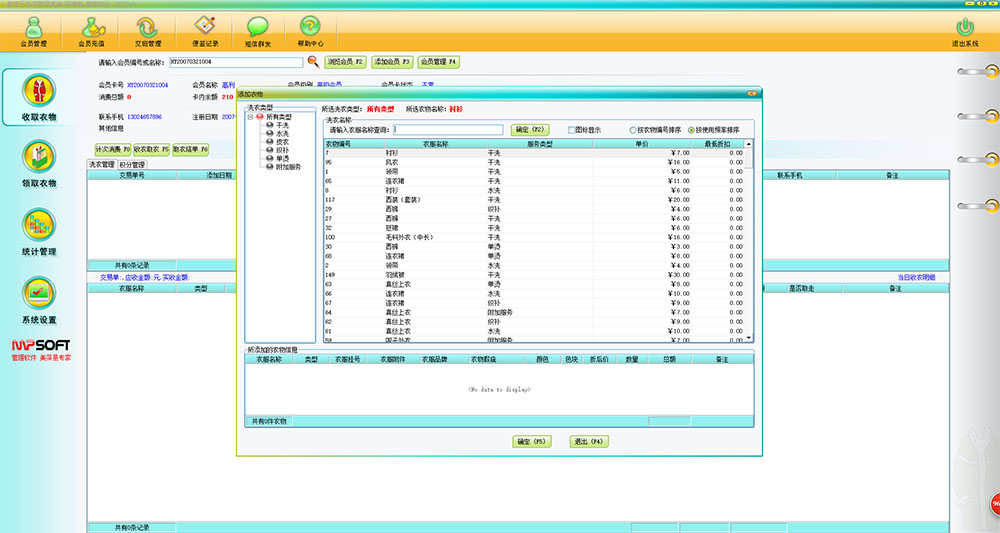 1、科学,专业的收衣功能。接收客户的预洗衣物,根据要求和提示输入衣物详细信息,包括衣服的颜色,附件,品牌,瑕疵,挂衣号和洗衣类型等。