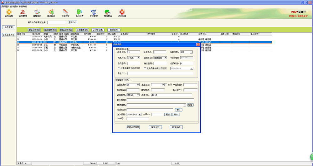 2、支持储值卡、折扣卡、计次卡,会员提醒(包括生日提醒),会员来电提示,短信群发。