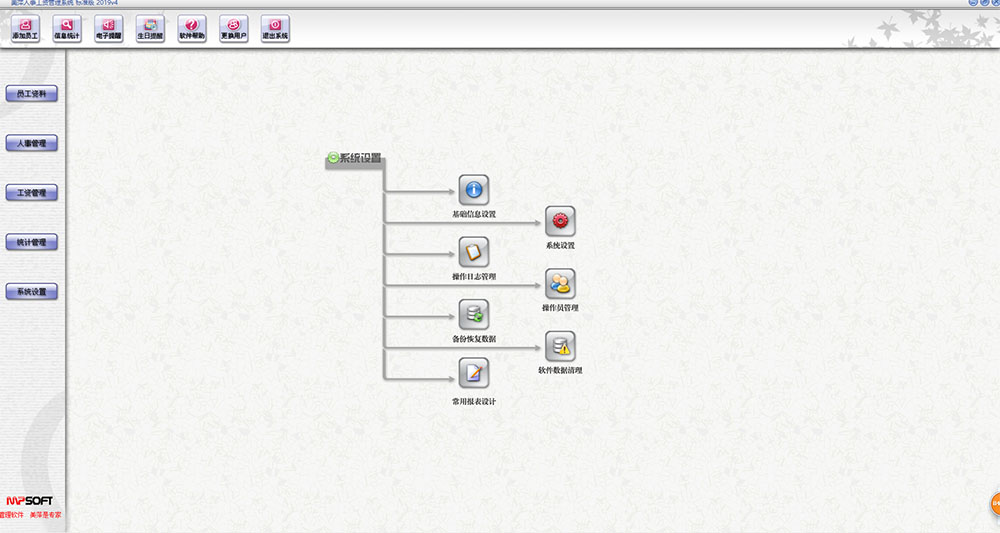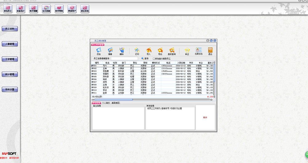 美萍人事工资管理系统是一款专业的人事档案管理软件,人事工资管理软件,美萍人事管理软件界面设计简洁,美观,其人性化的软件流程,使普通用户不需培训也能快速掌握软件操作使用方法,上手极易。强大的报表统计功能更是能让您完整的掌握企业,公司内部的人事,工资,档案的详细情况。美萍企业人事管理软件广泛适用于企业,公司的人事管理,档案管理,是您企业进行人力资源管理的强大工具。