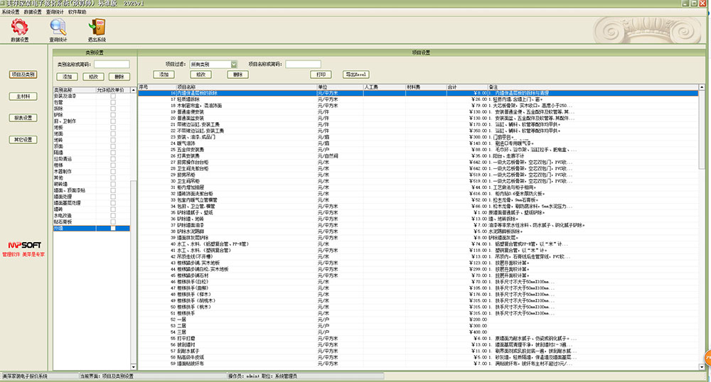 产品优势1、 项目及类别:项目信息中保存的是预算师预算得出的项目报价,工艺材料等信息,类别是每个项目所在的类型。