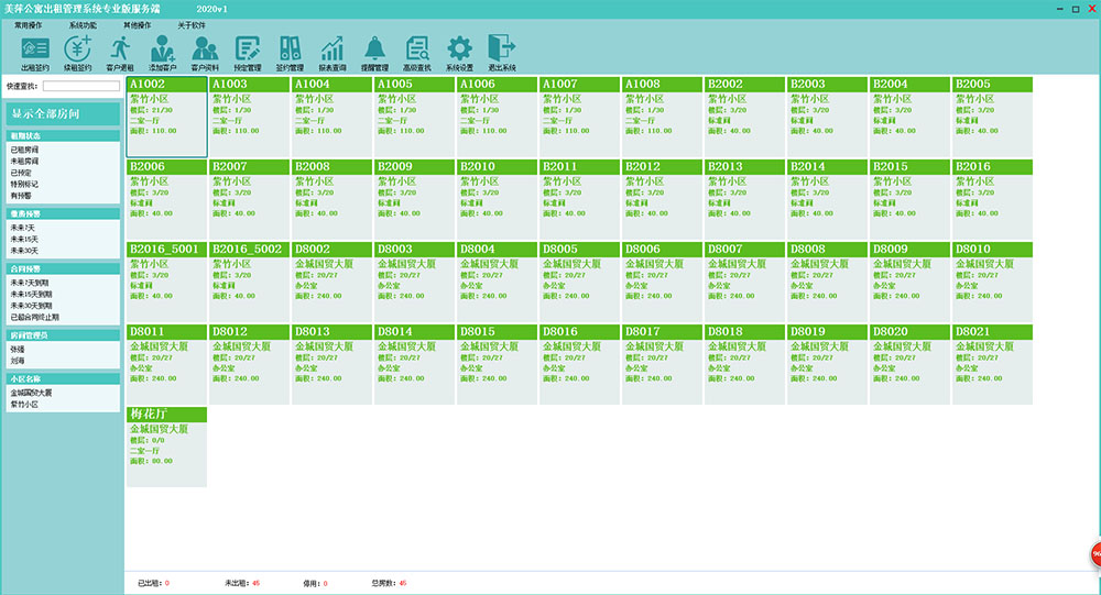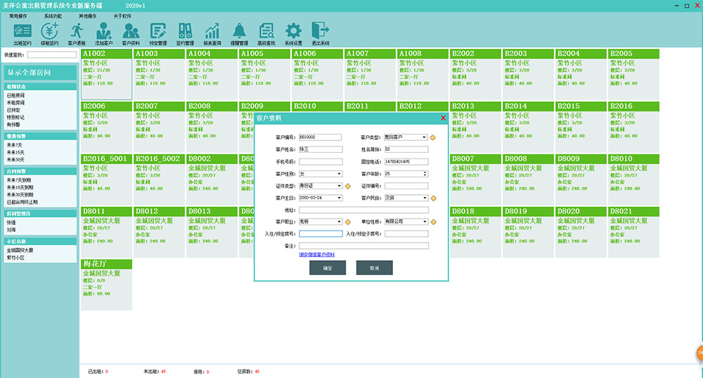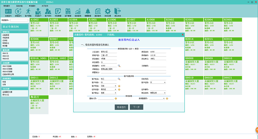 4、完善的客户管理、预定管理和签约管理,出租签约的向导式操作,费用清单的高度灵活性以及强大的费用计算公式定制,从软件的规范操作上规避软件复杂性,极大的提高工作效率。
