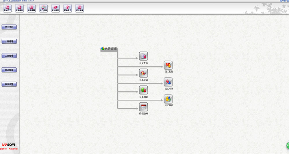 美萍人事工资管理系统是一款专业的人事档案管理软件,人事工资管理软件,美萍人事管理软件界面设计简洁,美观,其人性化的软件流程,使普通用户不需培训也能快速掌握软件操作使用方法,上手极易。强大的报表统计功能更是能让您完整的掌握企业,公司内部的人事,工资,档案的详细情况。美萍企业人事管理软件广泛适用于企业,公司的人事管理,档案管理,是您企业进行人力资源管理的强大工具。